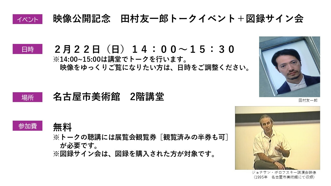 【2月22日(日)14:00~】4つの対話展 映像公開記念 田村友一郎トークイベント+サイン会 開催! 2026年02月17日(火曜日) ジョナサン・ボロフスキー講演会映像の限定公開を記念して、田村友一郎が映像を見ながらお話しします。トーク後はサイン会を開催! 詳しくはこちら お知らせ一覧